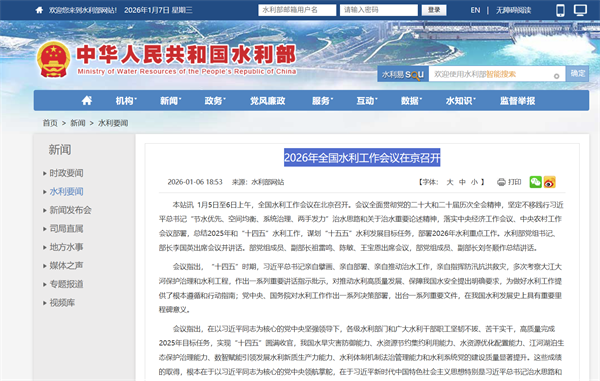 1月5日至6日上午,全国水利工作会议在北京召开。会议全面贯彻党的二十大和二十届历次全会精神,坚定不移践行习近平总书记“节水优先、空间均衡、系统治理、两手发力”治水思路和关于治水重要论述精神,落实中央经济工作会议、中央农村工作会议部署,总结2...